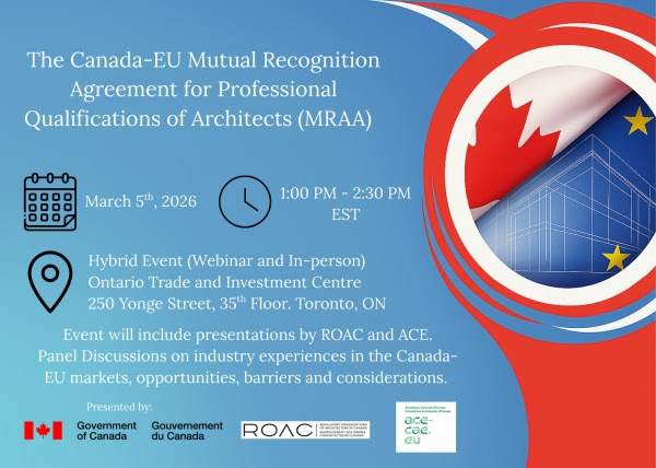 Global Affairs Canada is hosting a CETA MRAA event in Toronto, showcasing how the new EU–Canada MRAA makes it easier for architects to have their qualifications recognised and work across the Atlantic. Experts from ROAC and ACE will explain the process and share practical insights on opportunities, challenges, and real‑life cross‑border practice.